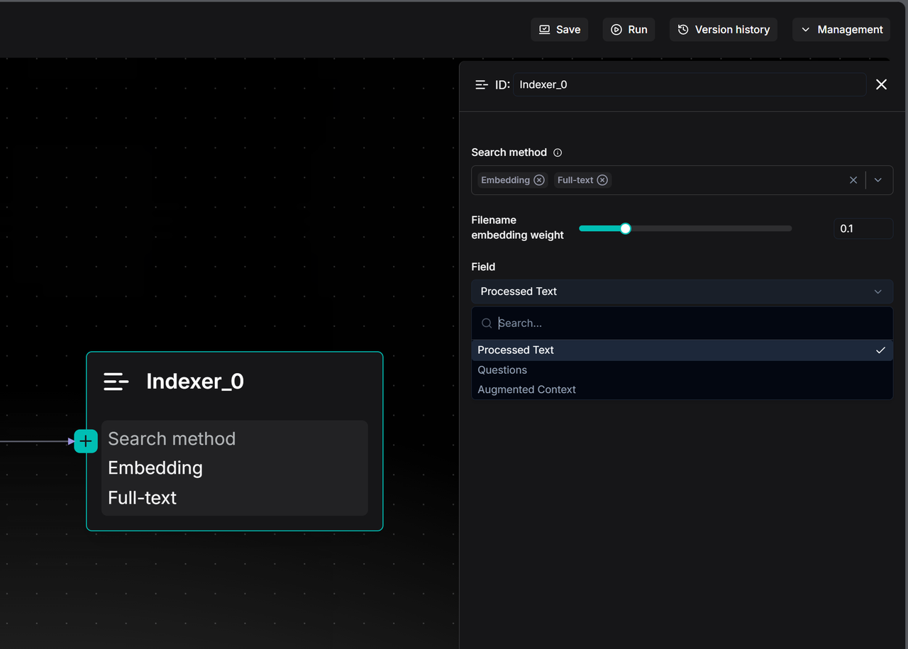 - Processed Text: This is the default option and the most intuitive. It means that the Indexer will index the processed text chunks from preceding nodes.