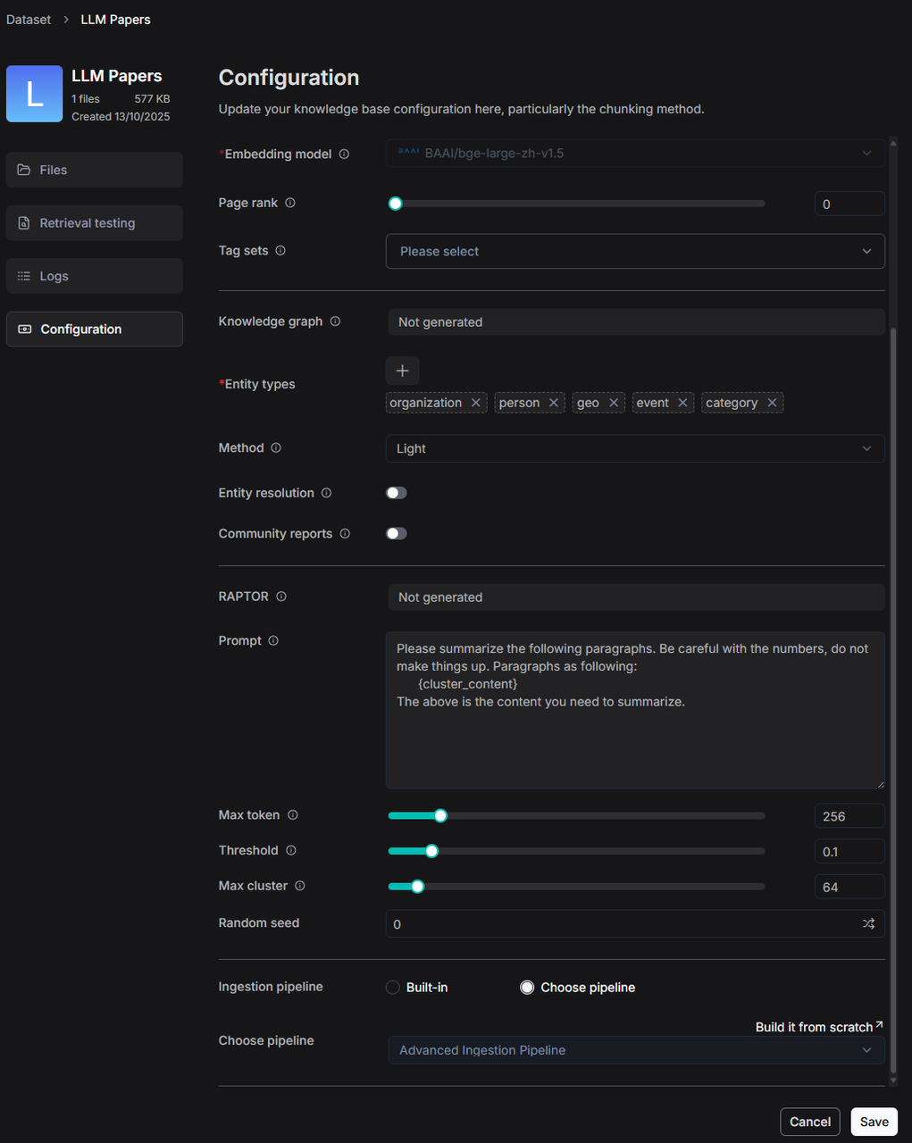 For an already created knowledge base, users can enter its "Ingestion pipeline" module at any time to readjust and reselect the associated parsing process.