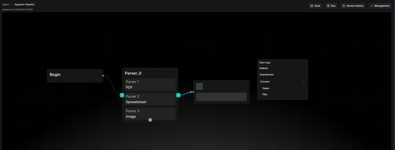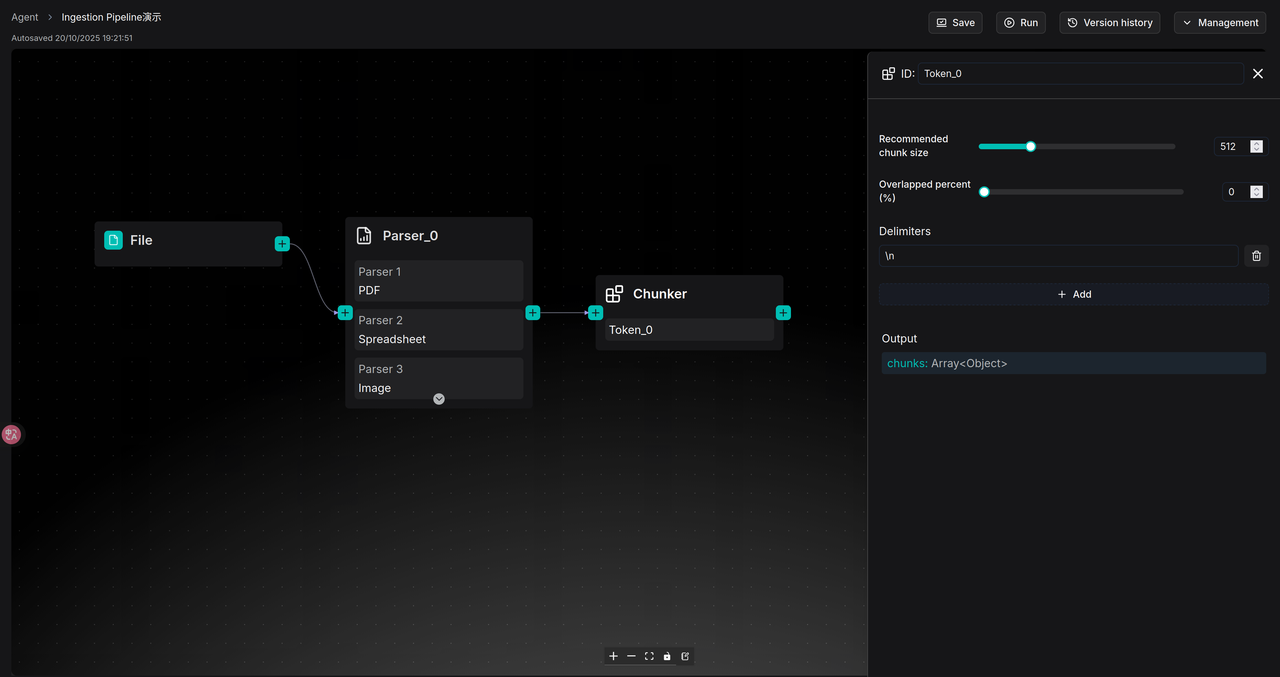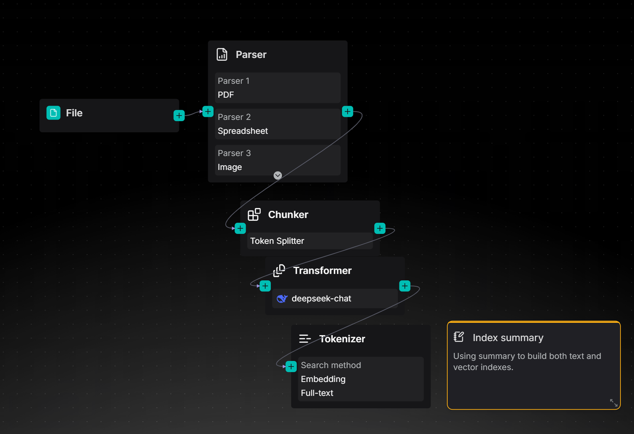 The Ingestion Pipeline is essentially a visual ETL process tailored for unstructured data. Built upon an Agent foundation, it restructures a typical RAG data ingestion workflow—which usually encompasses key stages such as document parsing, text chunking, vectorization, and index construction—into three distinct phases: Parser, Transformer, and Indexer. These phases correspond to document parsing, data transformation, and index construction, respectively.