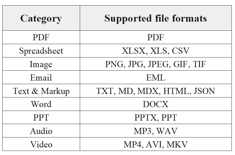 Currently, the Parser operator supports input from 8 major categories encompassing 23 file types, summarized as follows: