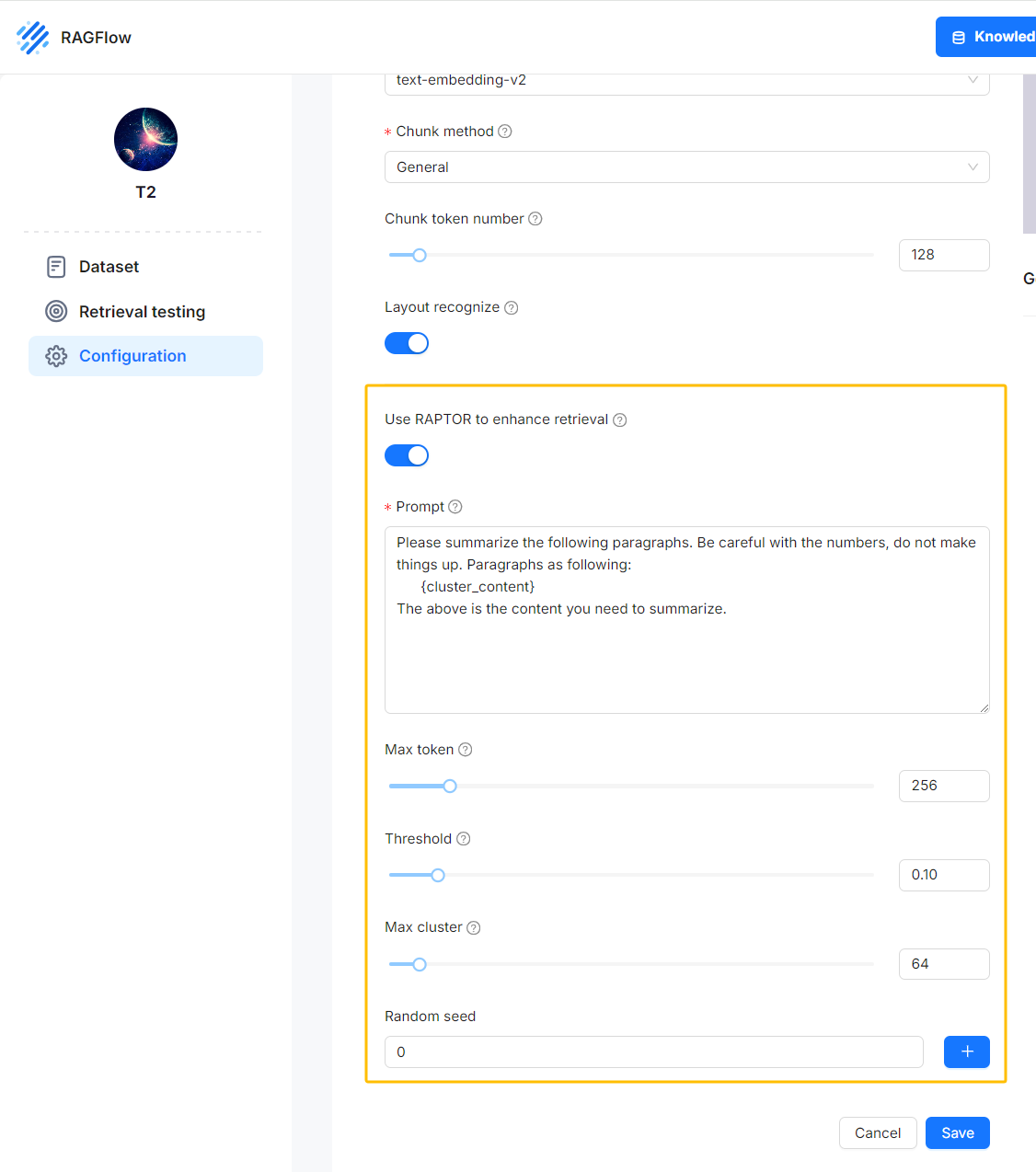 When you need better understanding of the long-context window, you can activate this RAPTOR switch to generate summaries from clustering outcomes.