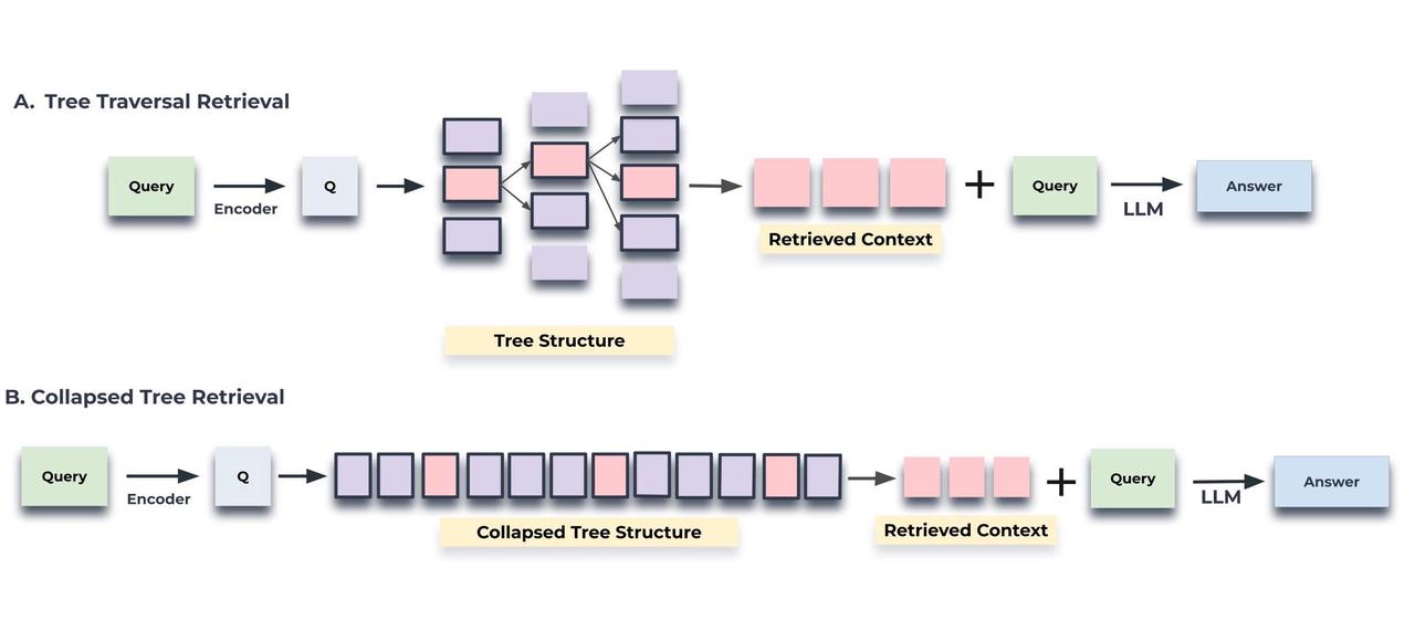 After dividing the original document into chunks, RAPTOR clusters these chunks in a recursive and hierarchical manner: the clustering process starts from the leaf nodes (the blue chunks in the graph), and sumarizes the leaves into higher-level information through embedding. The process is recursively executed, forming a “tree” structure starting from the leaves. The outcomes of the clustering process are summaries, which can be generated using LLM. The utilization of clustering and summary generation is essential because it captures finer details necessary for handling complex topic queries and multi-step reasoning in Q&A tasks. The RAPTOR paper discusses two processes for retrieval of the clustered content, as shown in the following figure: