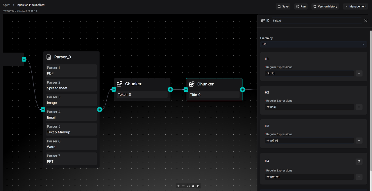 If the document itself has a clear chapter structure, segmenting the text by tokens may not be the optimal choice. In such cases, the Title option in the Chunker can be selected to slice the document according to its headings. This method is primarily suitable for documents with layouts such as technical manuals, academic papers, and legal clauses. We can customize expressions for headings at different levels in the Title node. For example, the expression for a first-level heading (H1) can be set as ^#[^#], and for a second-level heading (H2) as ^##[^#]. Based on these expressions, the system will strictly slice the document according to the predefined chapter structure, ensuring that each segment represents a structurally complete "chapter" or "subsection." Users can also freely add or reduce heading levels in the configuration to match the actual structure of the document, as shown in the following figure.
