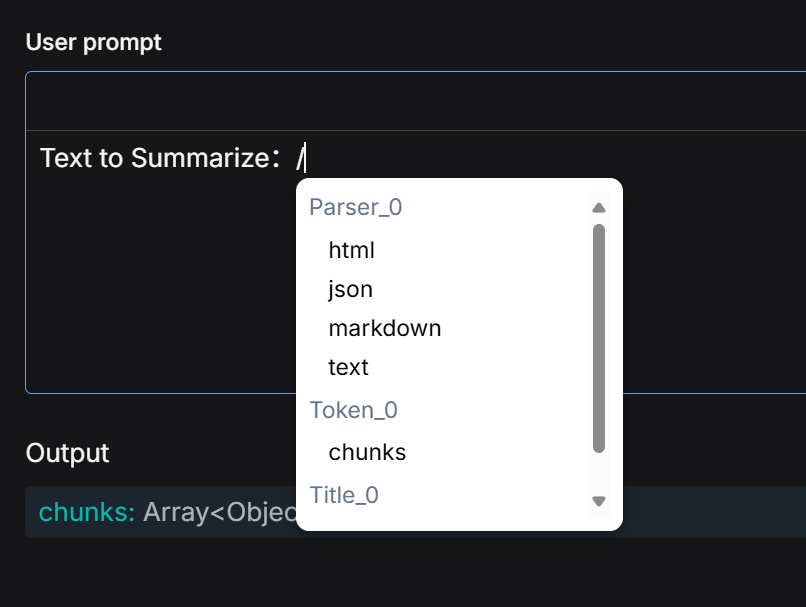 Please note: The Transformer node does not automatically acquire content from its preceding nodes. The actual source of information it processes entirely depends on the variables referenced in the User prompt. In the User prompt, variables output by upstream nodes must be manually selected and referenced by entering the / symbol.