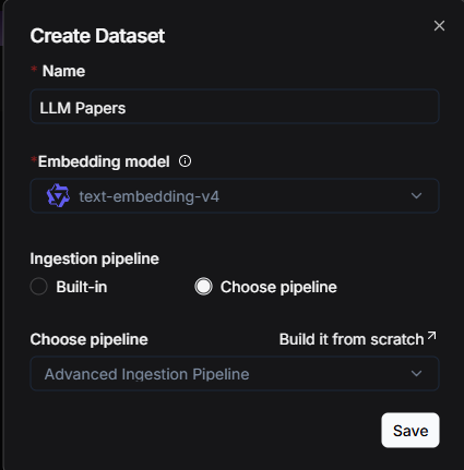 After constructing an Ingestion pipeline, the next step is to associate it with the corresponding knowledge base. On the page for creating a knowledge base, locate and click the "Choose pipeline" option under the "Ingestion pipeline" tab. Subsequently, select the already created Pipeline from the dropdown menu to establish the association. Once set, this Pipeline will become the default file parsing process for this knowledge base.