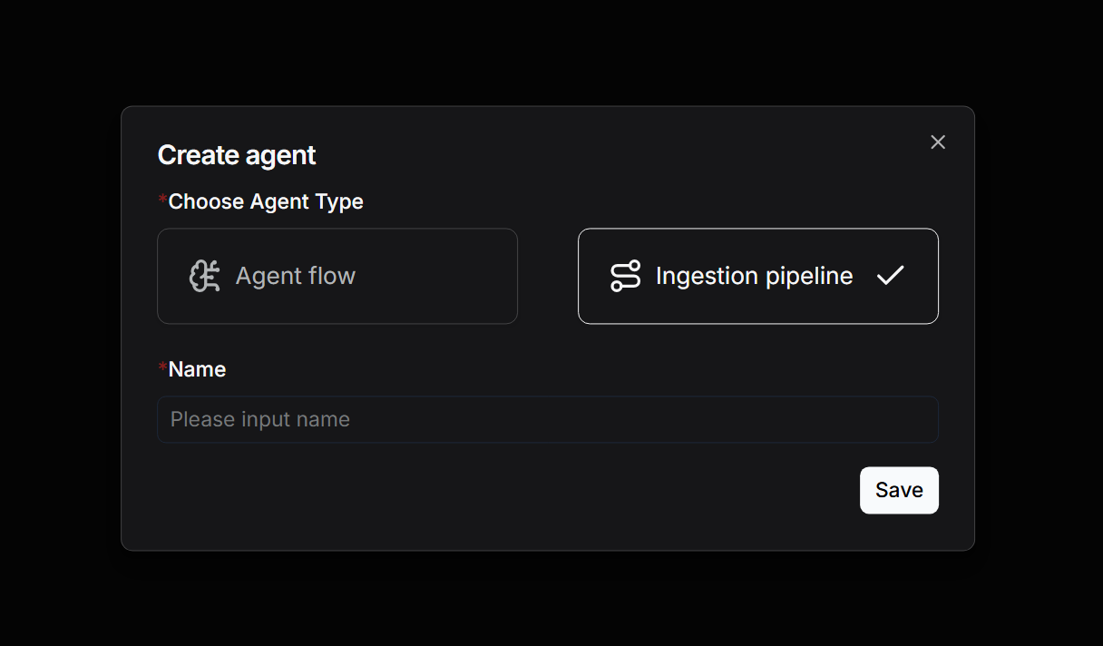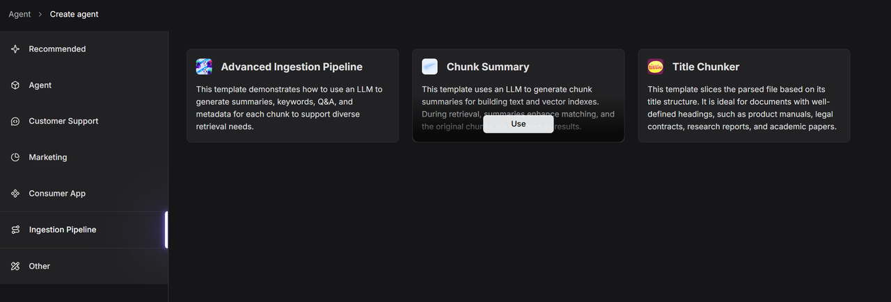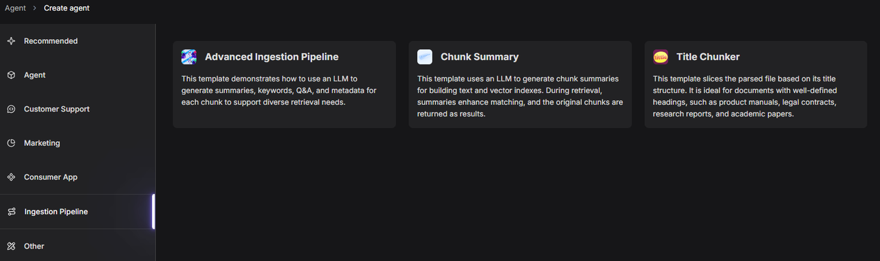 First, click on "Create agent" on the "Agent" page. You can choose "Create from blank" to create an Ingestion Pipeline from scratch: