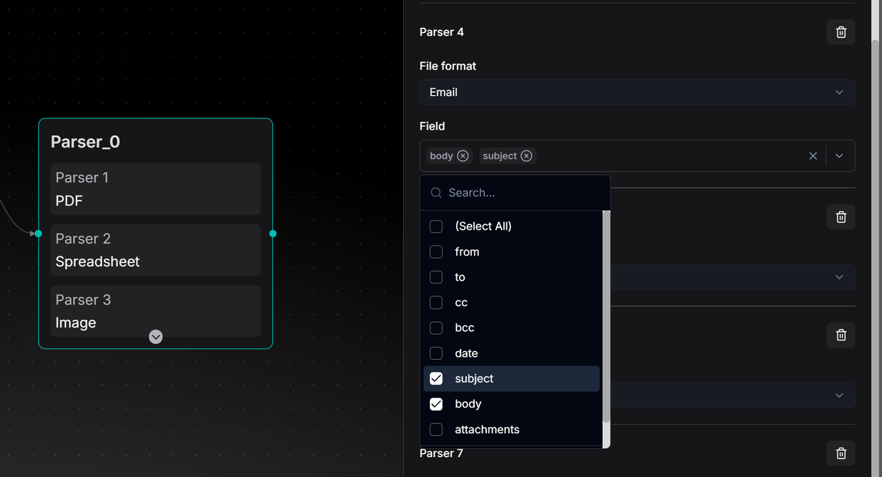 - When parsing Email files, RAGFlow provides Field options, allowing users to select only the desired fields, such as "subject" and "body." The Parser will then precisely extract the textual content of these fields.