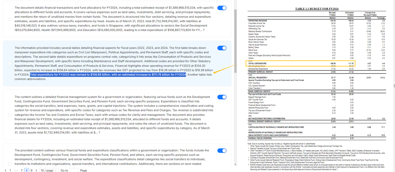 As shown in the following figure: the left half are the summaries generated by LLM from the clustering results. RAGFlow visualizes these summaries, which, together with the raw data, will be used in RAG’s retrieval process.