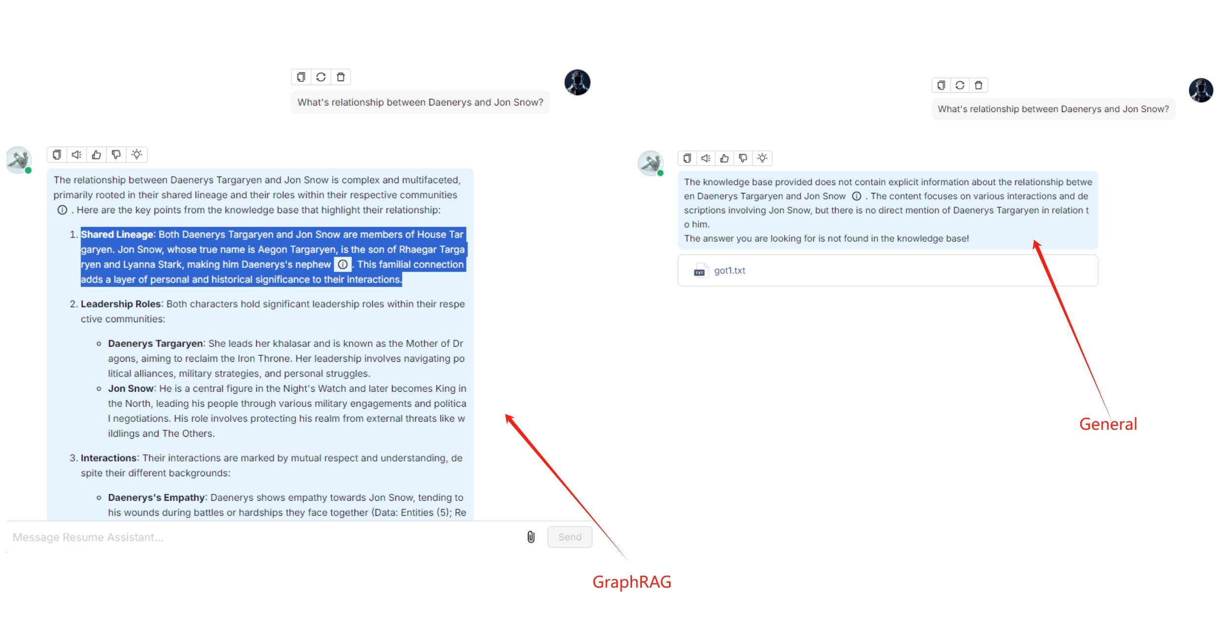 The following image juxtaposes dialogues generated from Game of Thrones. The dialogue on the left, generated using GraphRAG, demonstrates that GraphRAG provides more in-depth and comprehensive answers for multi-hop queries involving nested logic. The dialogue on the right, which is based on document parsed using the GENERAL parsing method, shows no result.